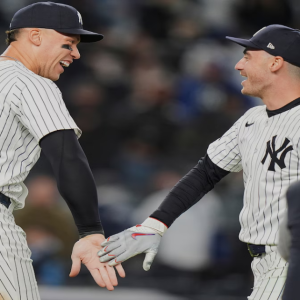 New York Yankees’ Aaron Judge, left, celebrates with Cody Bellinger after a baseball game against the Kansas City Royals Wednesday, April 16, 2025, in New York. (AP Photo/Frank Franklin II)AP…