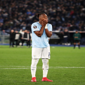 ROME, ITALY – APRIL 17: Tijjani Noslin of Lazio reacts after he misses the team’s third penalty in the penalty shoot out during the UEFA Europa League 2024/25 Quarter Final…