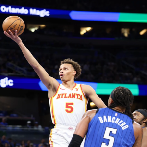 Apr 15, 2025; Orlando, Florida, USA; Atlanta Hawks guard Dyson Daniels (5) shoots the ball against the Orlando Magic in the first quarter at Kia Center. Mandatory Credit: Nathan Ray…
