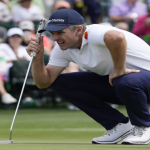 Apr 11, 2025; Augusta, Georgia, USA; Justin Rose prepares to putt on the 18th green during the second round of the Masters Tournament at Augusta National Golf Club. Mandatory Credit:…