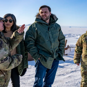 Vice President JD Vance (2R) and Second Lady Usha Vance (2L) listen to Col. Susannah Meyers (L), then-commander of the Pituffik Space Base, on a tour in Greenland on March…