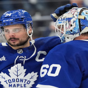 Toronto Maple Leafs centre Auston Matthews (34) consoles teammate Joseph Woll (60) in the final moments of third period NHL Stanley Cup playoff hockey action against the Florida Panthers, in…