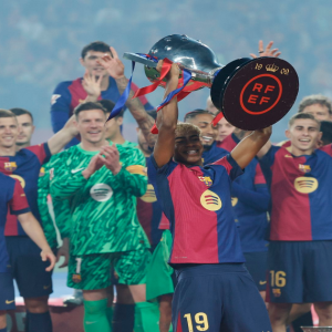 Lamine Yamal del Barcelona levanta el trofeo en la celebración tras ganar la liga española antes del encuentro ante el Villarreal el domingo 18 de mayo del 2025. (AP Foto/Joan…