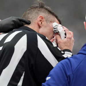 Referee Chris Rooney exits Maple Leafs-Panthers Game 7 after stick to face