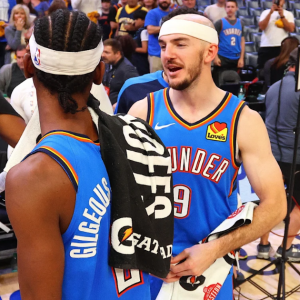 Apr 26, 2025; Memphis, Tennessee, USA; Oklahoma City Thunder guard Alex Caruso (9) and Oklahoma City Thunder guard Shai Gilgeous-Alexander (2) react after defeating the Memphis Grizzlies in game four…
