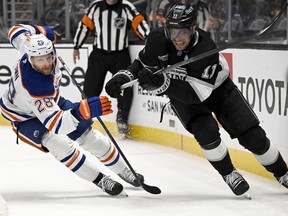 Los Angeles Kings center Anze Kopitar passes the puck away from Edmonton Oilers right winger Connor Brown during the first period of an NHL hockey game in Los Angeles on Saturday, April 5, 2025. Photo by Alex Gallardo /AP