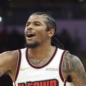 Mar 23, 2025; Houston, Texas, USA; Houston Rockets guard Jalen Green (4) reacts after a play during the second quarter against the Denver Nuggets at Toyota Center. Mandatory Credit: Troy…