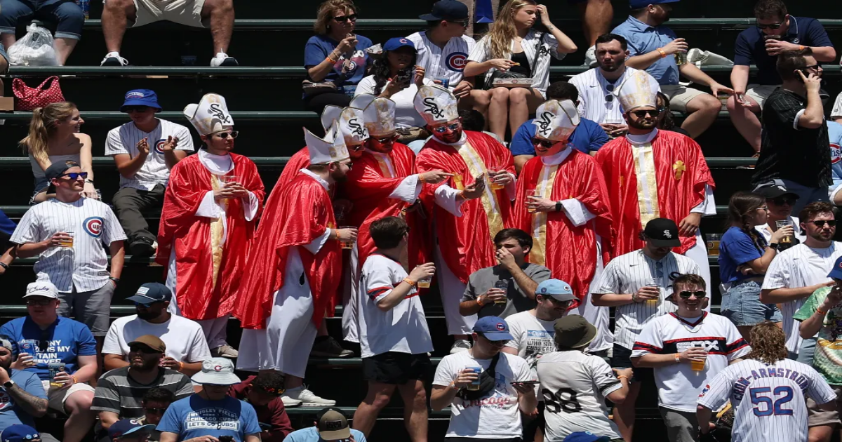 White Sox and Cubs fans arrive at Wrigley Field for a game between the teams on May 16, 2025. (Chris Sweda/Chicago Tribune)
