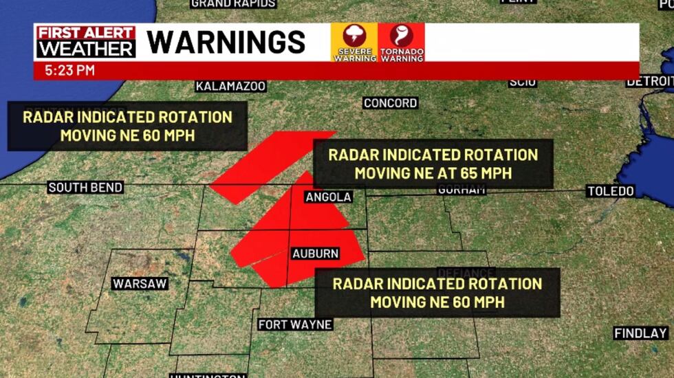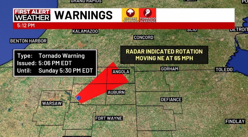 5:14 PM Update, March 30, 2025: A TORNADO WARNING issued for Noble, DeKalb, LaGrange, and Steuben counties until 5:30 PM.
