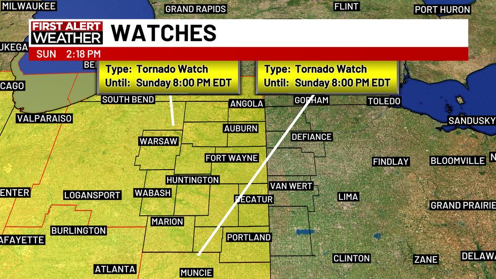 2:15PM Update, March 30, 2025: The 21Alive First Alert Weather Team issued a First Alert Weather Day for Sunday, March 30 because of the potential for severe thunderstorms. At 2:15pm ET, the National Weather Service issued a Tornado WATCH for all of Northern Indiana until 8pm Sunday. At the time of this update, this watch DOES NOT include any Ohio counties within 21Country.