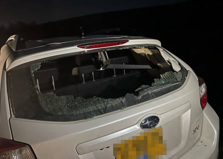 ‘‘The settlers destroyed his car with stones and slashed one of the tyres,’’ another witness, Raviv, told the Guardian. ‘‘All the windows and windshields were broken.’’