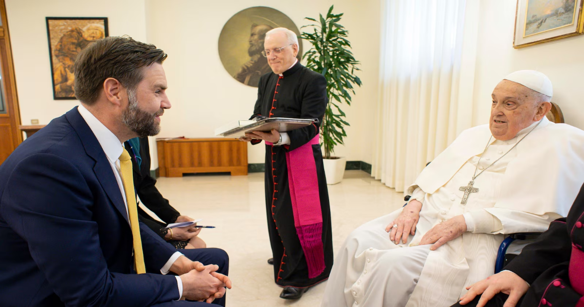 Pope Francis meets with Vice President JD Vance and a delegation during an audience at Casa Santa Marta, April 20, 2025, at the Vatican.
