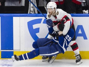 Ottawa Senators’ Nick Jensen (3) battles with Toronto Maple Leafs’ Pontus Holmberg (29) during Game 1. The Canadian Press