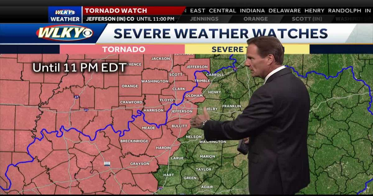 I’M VICKI DORTCH, I’M RICK VAN HOOSE. WE’LL HAVE MORE TEAM COVERAGE ON PREPARATIONS FOR THAT SEVERE WEATHER THREAT COMING UP IN JUST A FEW MINUTES. BUT FIRST, JAY HAS BEEN TRACKING THOSE STORMS. JAY, WHEN CAN WE EXPECT THIS THREAT TO HIT THE REGION? YEAH. VICKY, A LITTLE LATER ON THIS EVENING FOR THE METRO, WE’RE THINKING ANYWHERE FROM SEVEN, ESPECIALLY CLOSER TO 8 OR 9:00. A TORNADO WATCH HAS BEEN ISSUED FOR THE WESTERN ONE HALF OF THE VIEWING AREA. THIS GOES UNTIL 11:00 TONIGHT, BUT THIS WATCH COULD BE EXTENDED FARTHER EAST AS THE EVENING HOURS UNFOLD. SO FAR, THE RADAR NOT SHOWING MUCH. GOOD TO SEE. AFTER THE SHOWERS AND STORMS, WE HAD THIS MORNING. THAT DID PUT DOWN SOME HAIL PRODUCING ACTIVITY, IF YOU WILL, TO THE SOUTH OF THE METRO, BUT YOU CAN SEE OFF TO THE WEST. WE’RE STARTING TO GET SHOWERS AND STORMS SHOWING UP ON THE SCAN, AND THE FARTHER WEST WE GO, WE HAVE SUPERCELLS THAT HAVE FIRED UP IN THE HEAT AND HUMIDITY OFF TO THE WEST OF US. THERE’S ONE CLUSTER NEAR CHAMPAIGN PUSHING TOWARDS INDIANAPOLIS. THERE’S ANOTHER CLUSTER HERE IN SOUTHERN ILLINOIS DOWN TO NEAR PADUCAH. BY THE WAY, THERE’S A TORNADO WARNING NOW IN EFFECT FOR THE PADUCAH AREA. A TORNADO HAS BEEN SPOTTED ON THE GROUND HEADING TOWARDS THAT CITY. AND THAT SUPERCELL IS EXPECTED TO BE A LONG TRACK SUPERCELL. IN OTHER WORDS, MOVE ACROSS PORTIONS OF SOUTHERN KENTUCKY OVER THE NEXT COUPLE HOURS AND COULD COME CLOSE TO OUR SOUTHERN COMMUNITIES. SO LET’S TIME OUT THE STORMS FOR YOU NOW. AGAIN, IS THIS GOING TO BE A SOLID LINE WITH WIND DAMAGE EVERYWHERE? NO, I DON’T THINK SO ANYMORE. I THINK IT’S GOING TO BE CELLULAR IN NATURE. THAT MEANS THE STORMS WILL BE SCATTERED. THAT MEANS THE POTENTIAL DAMAGE WILL ALSO BE SCATTERED. YOU CAN SEE THE LATEST FUTURECAST SHOWING A COUPLE OF CLUSTERS. THAT’S THE BIG SUPERCELL THAT’S COMING OUT OF PADUCAH. AND THAT COULD COME VERY CLOSE TO YOU FOLKS IN GRAYSON COUNTY, PERHAPS BOWLING GREEN AND CATCH OUR SOUTHERN COMMUNITIES AS THE EVENING HOURS WEAR ON. OKAY, HERE’S 8:00 TONIGHT. NOTICE WE’VE GOT STORMS ON TOP OF THE METRO. ANY ONE OF THESE STORMS YOU SEE WILL BE SCATTERED, HAS THE POTENTIAL TO PRODUCE SEVERE WEATHER, HAIL, HIGH WINDS, EVEN A TORNADO SPIN UP. SO AGAIN, DON’T PUT DOWN YOUR GUARD. STAY VERY WEATHER AWARE FOR THE FIRST HALF OF THE NIGHT AS WE MOVE TOWARDS 10:00 11:00, STILL IN THE THICK OF IT. AND THEN FINALLY BY MIDNIGHT, EVERYTHING IS SINKING OFF TO THE SOUTHEAST WILL BE COMING OUT OF THE SEVERE ALERT, I THINK AFTER MIDNIGHT WE WILL BE DONE WITH ANY AND ALL SEVERE WEATHER CHANCES WITH EVEN SKIES CLEARING AS WE MOVE THROUGH THE OVERNIGHT PERIOD. SO YOUR DETAILED 12 HOUR FORECAST. WE’RE 81 WARM AND HUMID RIGHT NOW, MOVING TOWARDS EIGHT, NINE, TEN, 11:00 TONIGHT WE HAVE THE SEVERE ALERT IN EFFECT FOR SCATTERED STRONG TO SEVERE STORMS. AGAIN, ALL HAZARDS ON THE TABLE. AND THEN BY MIDNIGHT THE THREAT WILL BE SINKING OFF TO THE SOUTHEAST. VICKY RICK. OVERNIGHT TONIGHT WE’LL ACTUALLY SEE CLEARING SKIES AS COOLER LESS HUMID AIR BUILDS INTO THE REGION. MORE ON THE STORMS. AND OF COURSE YOUR WEEKEND WEATHER GUYS THAT IS COMING UP IN THE NEXT CHECK. ALL RIGHT. THANK YOU JAY. EMERGENCY MANAGEMENT CREWS FROM AROUND THE AREA HAVE BEEN PREPARING FOR THESE STORMS ALL DAY. ADDIE MEINERS SPOKE WITH THOSE CREWS TODAY TO FIND OUT WHAT PREPARATION LOOKS LIKE. SHE JOINS US NOW LIVE TO TELL US MORE ADDIE. YEAH. HERE IN DOWNTOWN LOUISVILLE, WE’RE STANDING RIGHT NEXT TO METRO SAFE, WHICH IS WHERE JEFFERSON COUNTY’S EMERGENCY MANAGEMENT OFFICIALS ALL GATHER TO WATCH AS THESE STORMS ROLL THROUGH HERE AND ARE BEGINNING TO APPROACH THE AREA. NOW, IN OTHER COUNTIES, THEY DO HAVE A SIMILAR SETUP, BUT JUST A LITTLE BIT ON A SMALLER SCALE. STILL, ALL OF THE EMERGENCY MANAGEMENT OFFICIALS THAT I SPOKE WITH TODAY ALL SAID THAT THEY WERE DOING THE SAME THING. THEY’RE GETTING CREWS ON STANDBY. THEY’RE ALSO GETTING ALERTS OUT TO THE PUBLIC ON SOCIAL MEDIA. AND SOME ARE EVEN GETTING COMMUNITY SHELTERS READY HERE IN JEFFERSON COUNTY, EMERGENCY MANAGEMENT OFFICIALS JUST CAME IN TO METRO SAFE TO BEGIN WATCHING THE STORMS AS IT CLOSES IN ON OUR AREA. NOW, EMERGENCY MANAGEMENT DEPUTY DIRECTOR KELLY JONES SAYS THE MAIN THING CREWS WILL LOOK AT IS WHAT KIND OF DAMAGE THE STORM IS DOING IN █OTHER PLACES BEFORE IT ARRIVES HERE IN LOUISVILLE. THEN THEY’LL HAVE APPROPRIATE STAFF HERE AT METRO SAFE SO THEY CAN RESPOND ACCORDINGLY. AFTER THE STORM PASSES THROUGH, WE LOOK AT A LOT OF THINGS. DO WE GET FLASH FLOODING? WHAT’S THE FLOODING LOOK LIKE? WHAT’S THE WIND DAMAGE? WHAT’S THE WIND SHEAR? DID A TORNADO END UP TOUCHING DOWN? A LOT OF THAT PLAYS INTO THE FACT IS WHETHER OR NOT PEOPLE NEED TEMPORARY SHELTER AND HOUSING AND THAT THAT TYPE OF THING. WHERE DOES IT HIT IF IT HITS AT ALL? IT KIND OF SELF DICTATES. YEAH. AND ANOTHER REALLY INTERESTING THING THAT KELLY POINTED OUT TO ME IS ABOUT OUTDOOR TORNADO SIRENS. HE SAYS IF YOU’RE INDOORS, YOU SHOULD NOT BE RELYING ON OUTDOOR SIRENS TO GIVE YOU THAT WARNING. INSTEAD, YOU SHOULD HAVE MULTIPLE WAYS TO GET A TORNADO WARNING. IF ONE WERE TO BE ISSUED A COUPLE OF WAYS YOU CAN DO THAT. YOU CAN DOWNLOAD OUR FREE T MOBILE APP, OR YOU CAN SIGN UP FOR THE CITY’S LENS ALERTS. NOW WE’LL HAVE MORE INFORMATION ON HOW YOU CAN DO THAT AHEAD OF THESE STORMS AVAILABLE ON OUR WEBSITE.